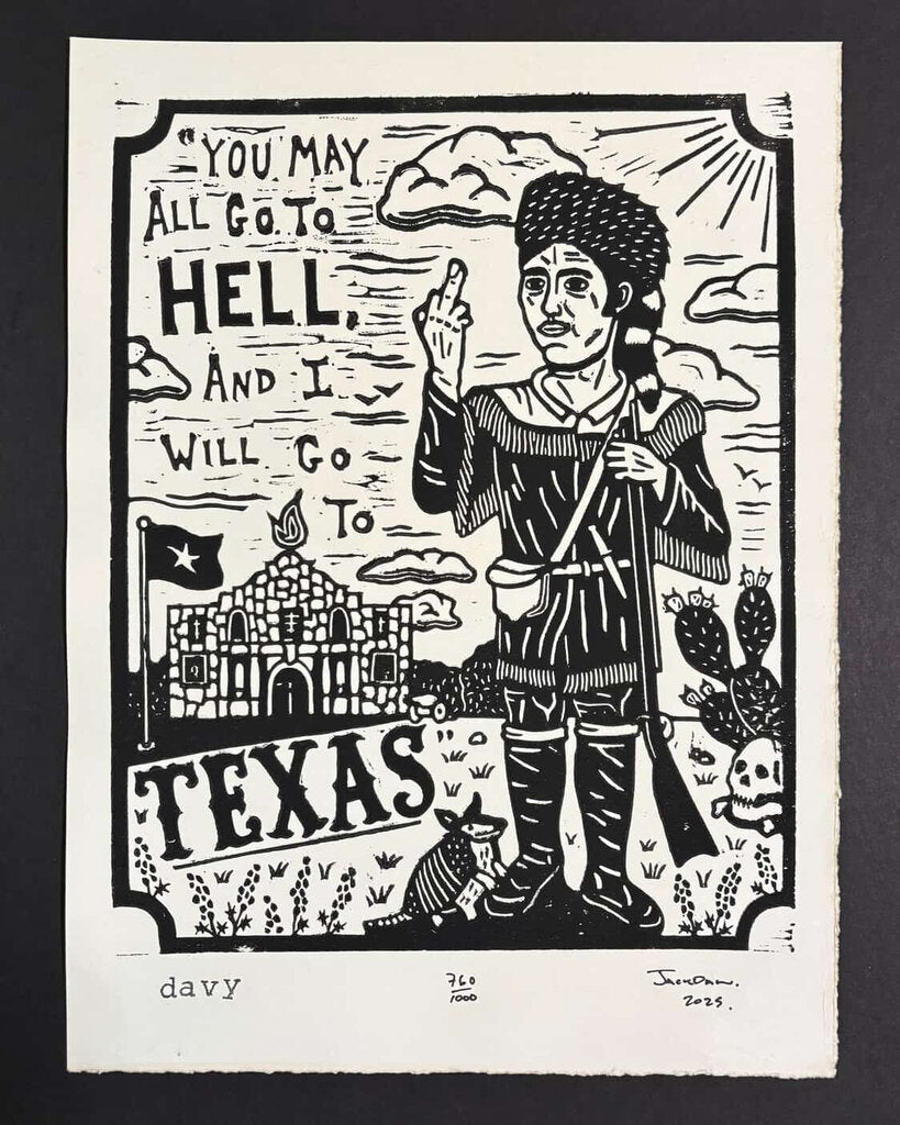 Each piece is carved by hand and lovingly and uniquely printed via old-timey roller press onto hand-torn and tea-stained 140lb art paper.