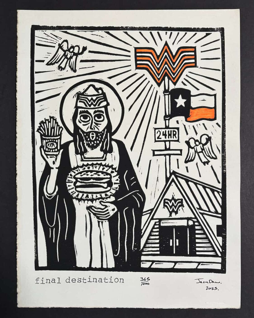 Each piece is carved by hand and lovingly and uniquely printed via old-timey roller press onto hand-torn and tea-stained 140lb art paper.