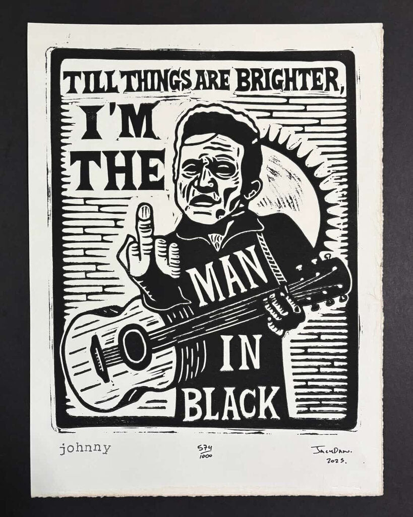 Each piece is carved by hand and lovingly and uniquely printed via old-timey roller press onto hand-torn and tea-stained 140lb art paper.