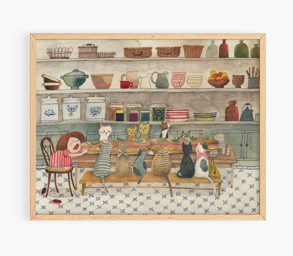 From the artist: We have two cats in the house. They have been our family and also best friends to my children. When I saw my daughter was playing with one of the cats I imagined "what if she could do anything she wanted with the cats?" This idea came up with this illustration. Maybe she would eat a giant sandwich with them... ?