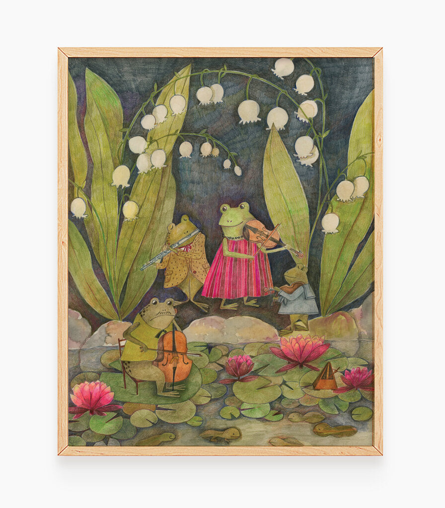From the artist: I created this illustration when I was given a theme, "Metamorphosis," by my local favorite toy store/gallery. It was an idea that the frogs decided to play music to hope their tadpole babies well-growths in the middle of a quiet night.